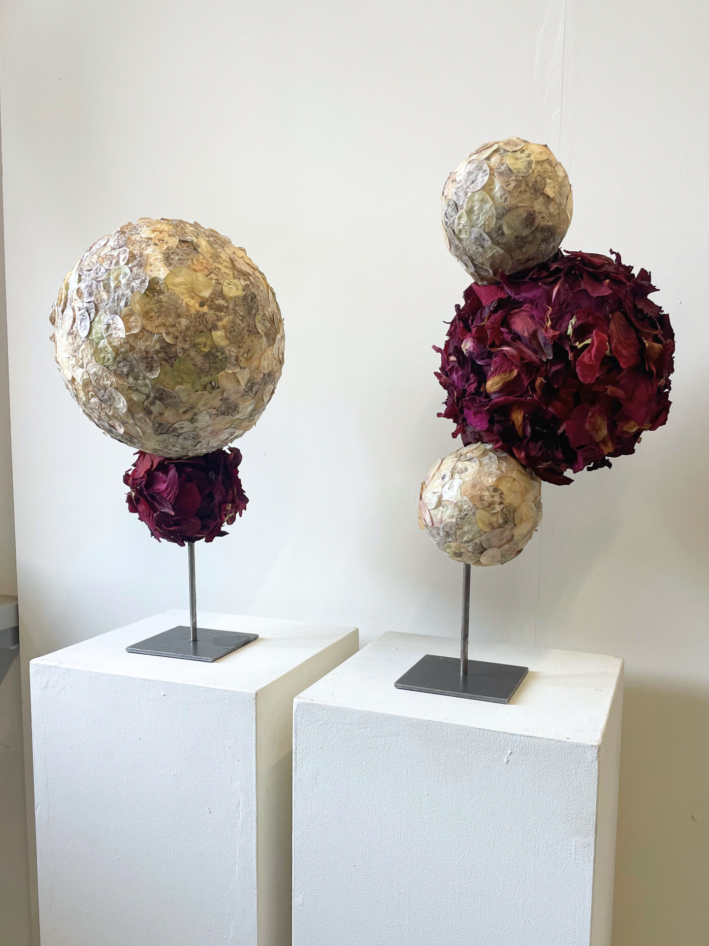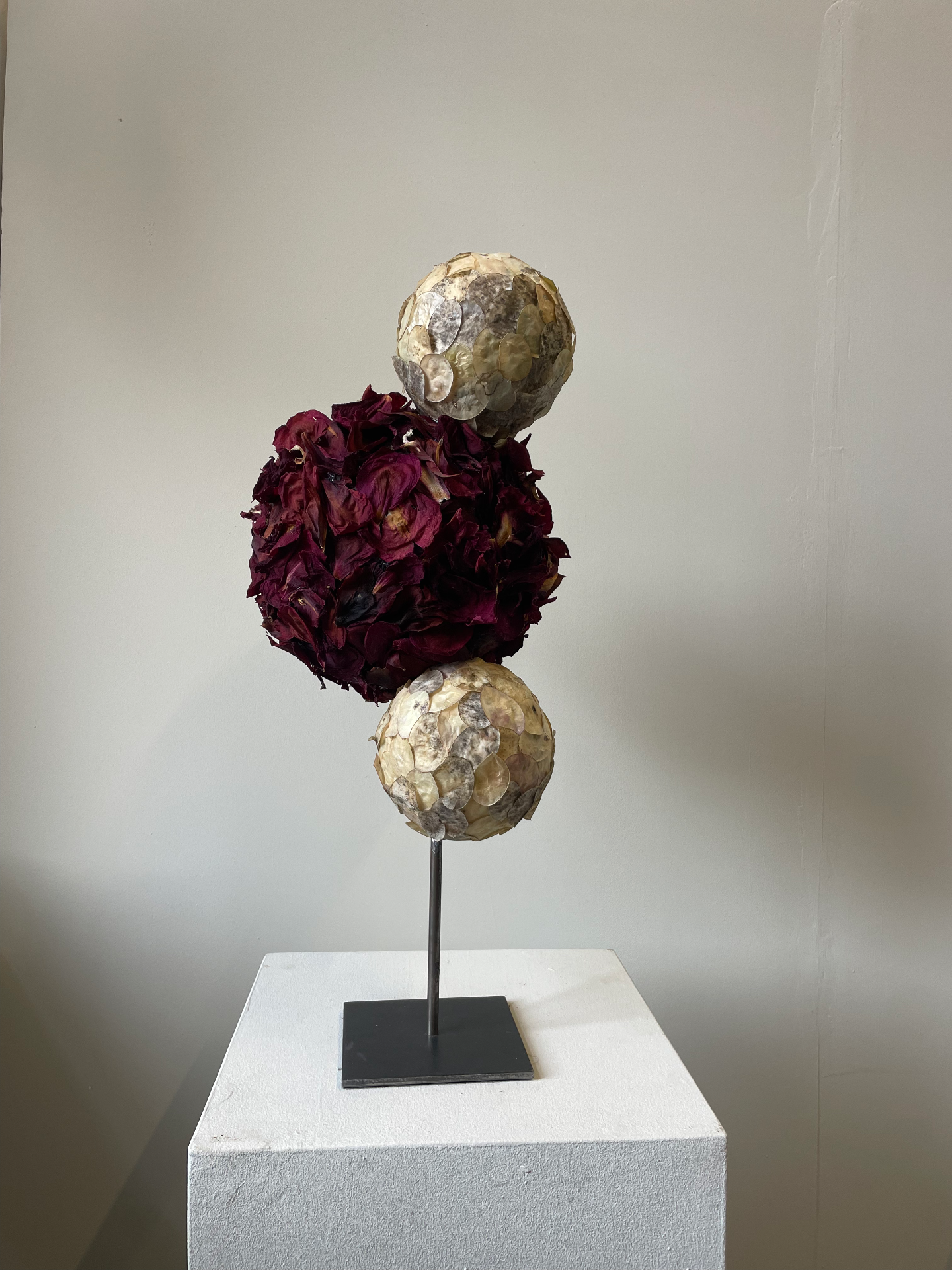 Sphere sculpture on raw metal sculpture stand, 50 x 25 x 25 cm